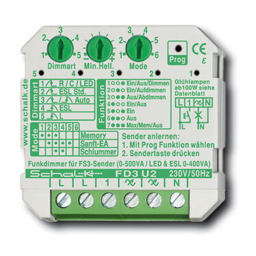 The compact dimensions of the FD3 U2 allow it be installed in electrical boxes behind a button switch from any desired product line, making it equally suitable for new installations as well as for maintenance-free replacement of existing or defective rotary or button dimmers.